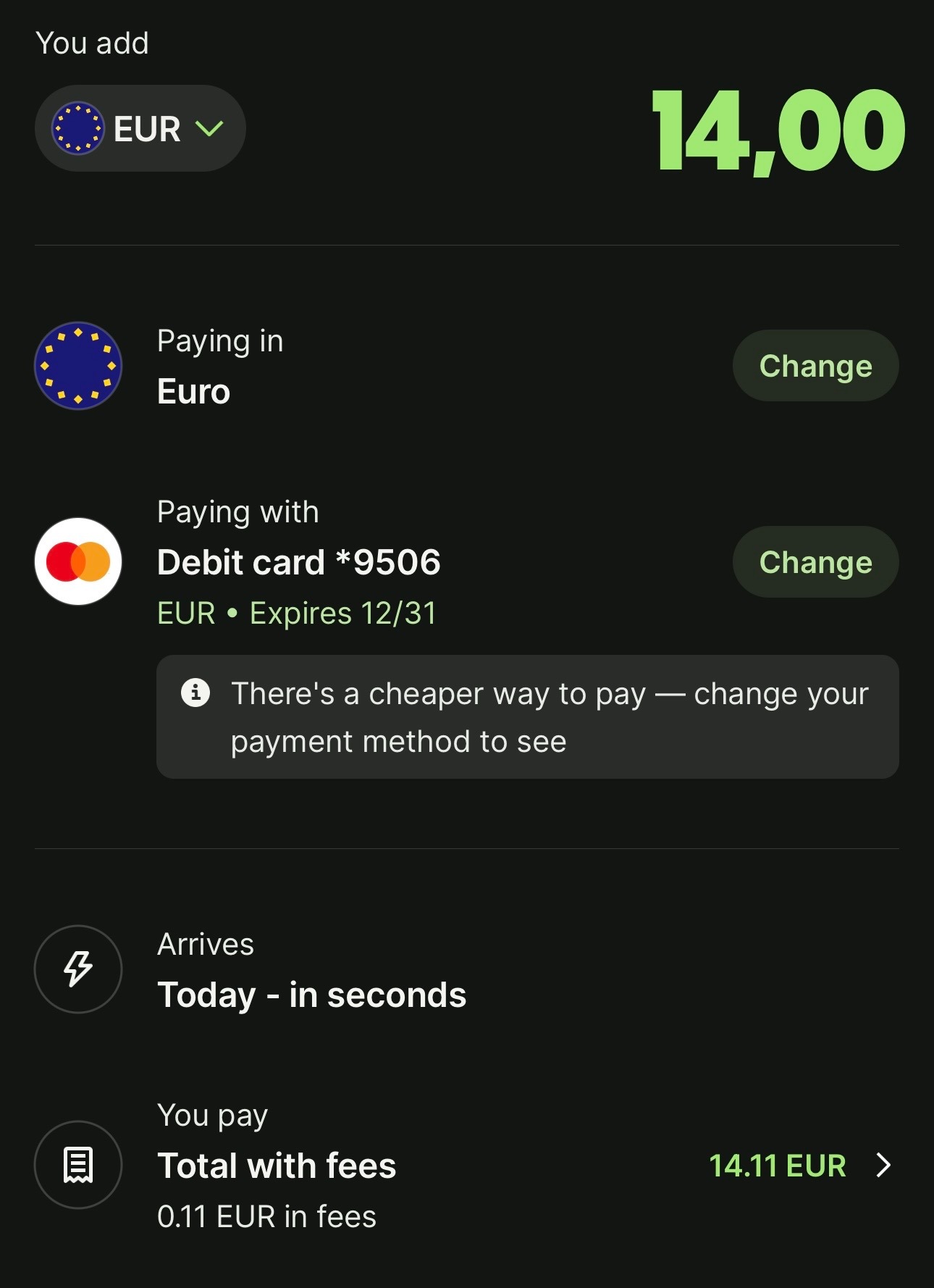 Input your amount and toggle on whether you’re paying in USD or EUR and which card you’re sending the money from. Wise even shows you cheaper ways to pay! It always makes sure you’re getting the best deal.