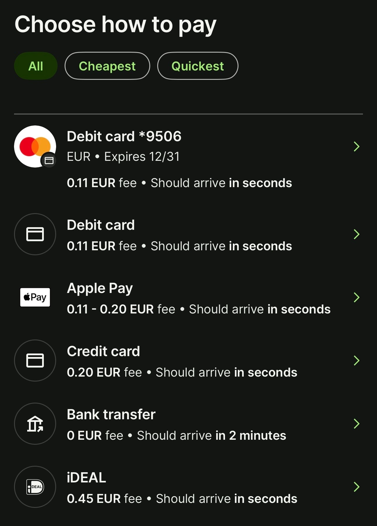 These are the “Cheaper ways to pay” options for my current transaction. These prices will vary depending on your total amount. And even if you don’t see the “Cheaper ways to pay” option, it usually means you are getting the best deal in that moment.