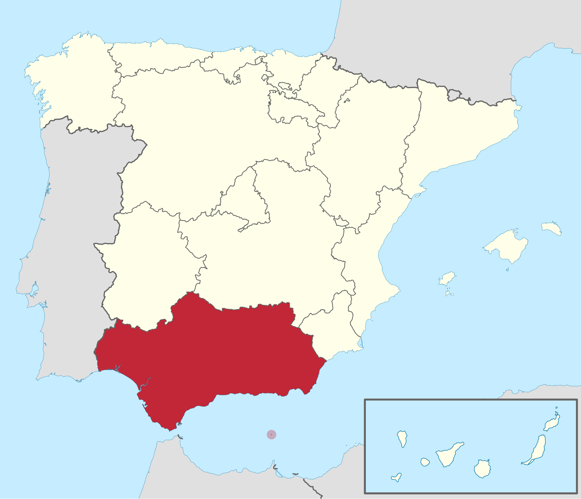 Major cities: Almería, Cádiz, Córdoba, Granada, Huelva, Jaén, Málaga, Sevilla