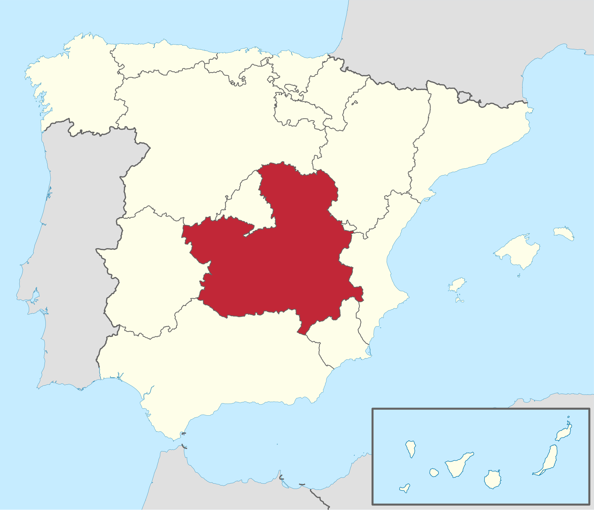 Major cities: Toledo, Albacete, Ciudad Real, Cuenca, Guadalajara